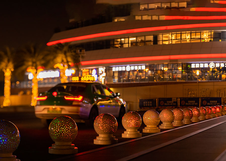 新型路障石材具有擋車功能,提升場所的形象和安全性,夜晚展現出特別絢麗的效果